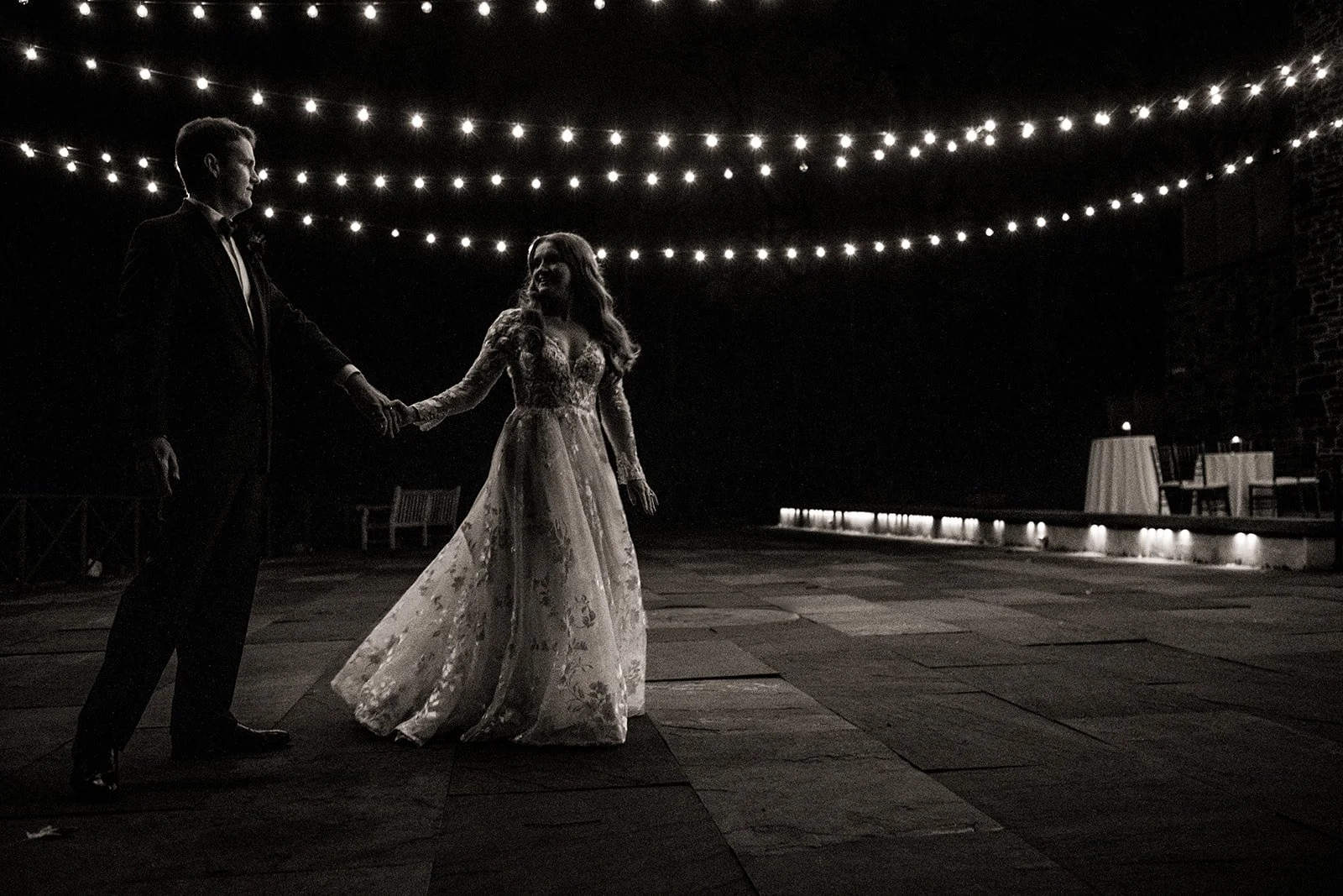 Tatyana and Will’s wedding was just before Christmas and their reception was in the NY Botanical Gardens. It was a cold day, and it was perfect. They leaned in to the Christmas theme and used the colors and obvious decor of the season, and their wedding was infused with the joy and wonder that is a hallmark of the Christmas season. Even their impromptu first dance practice, outside under the twinkly lights on the patio of the NYBG Stone Mill had the air of Christmas magic about it.